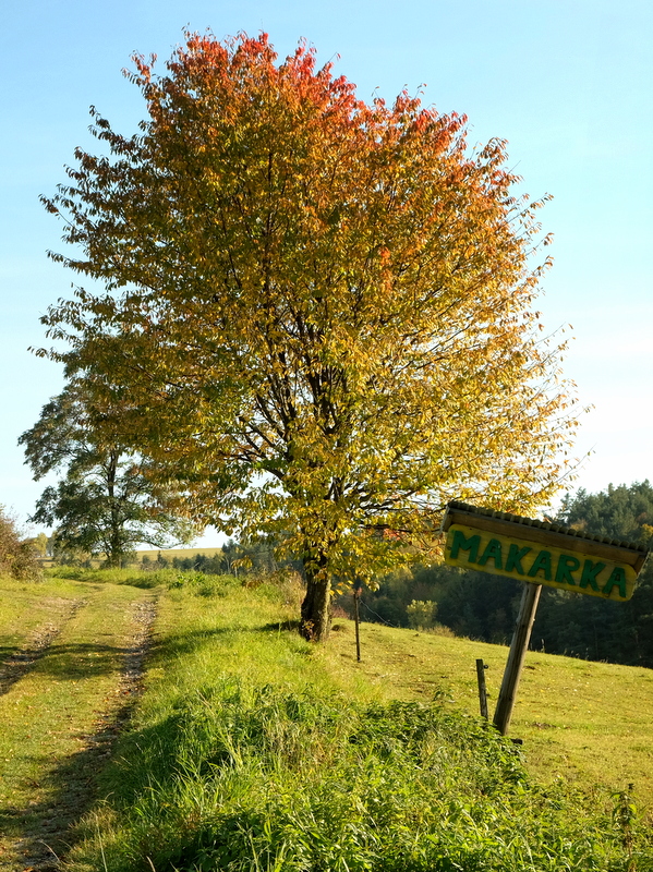 Piękne jest też otoczenie drogi, która łączy Makarkę z Brzezową. Zwłaszcza teraz, w połowie października, kiedy mamy piękną, słoneczną pogodę i ładnie wybarwione liście drzew i krzewów.