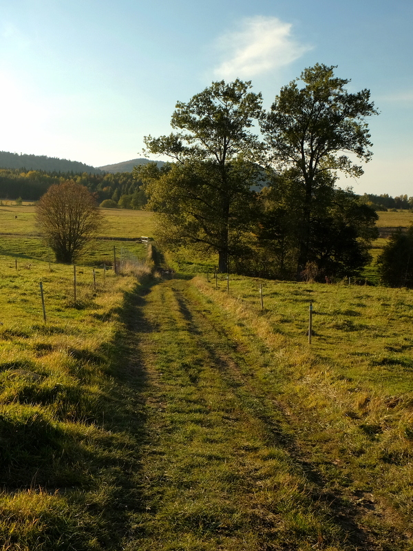 Na skrzyżowaniu polnych dróg skręcam na północ kierując się w stronę Jelenia. Gruntowa droga obniża się w zarośnięte drzewami siodło po minięciu którego zaczyna się nieco wznosić.