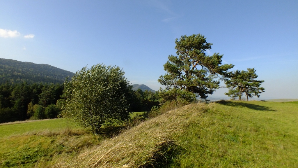 Widok na grodzisko wczesnośredniowieczne "Walik". Z lewej Góra Zamkowa nad Mrukową.