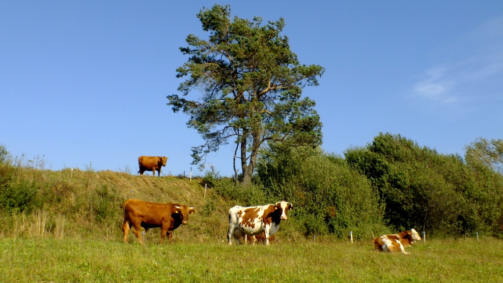 Wał grodziska “Walik” i zaciekawione krowy.