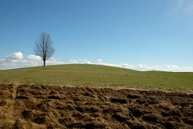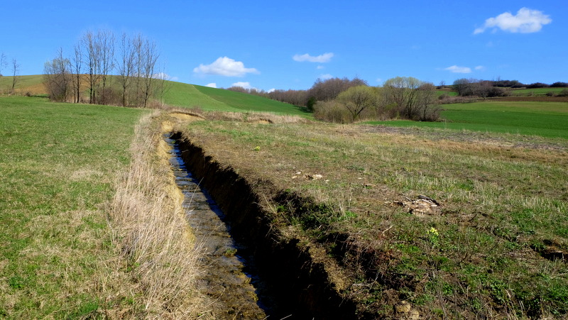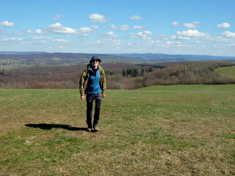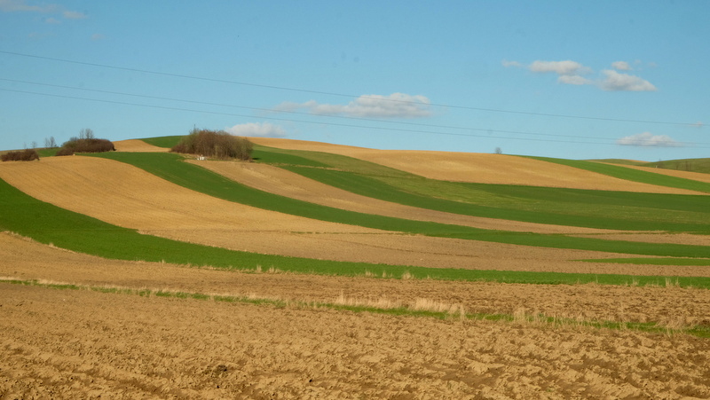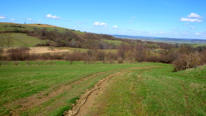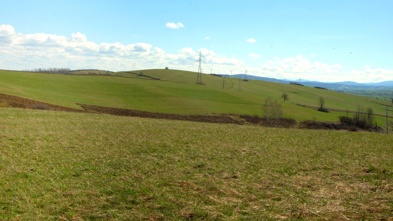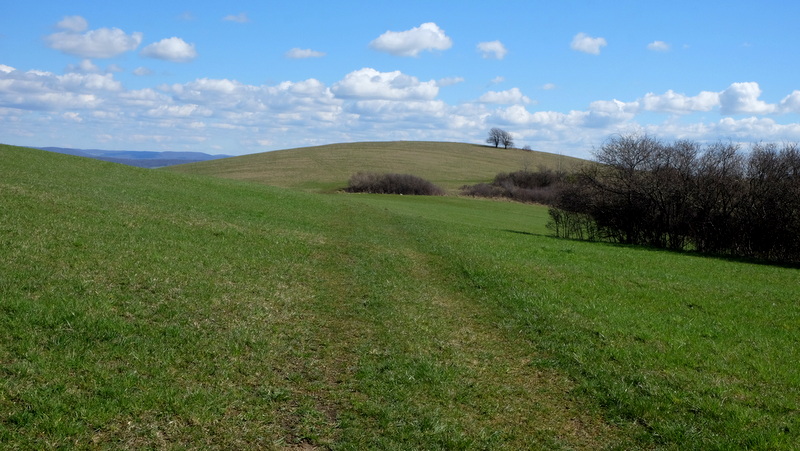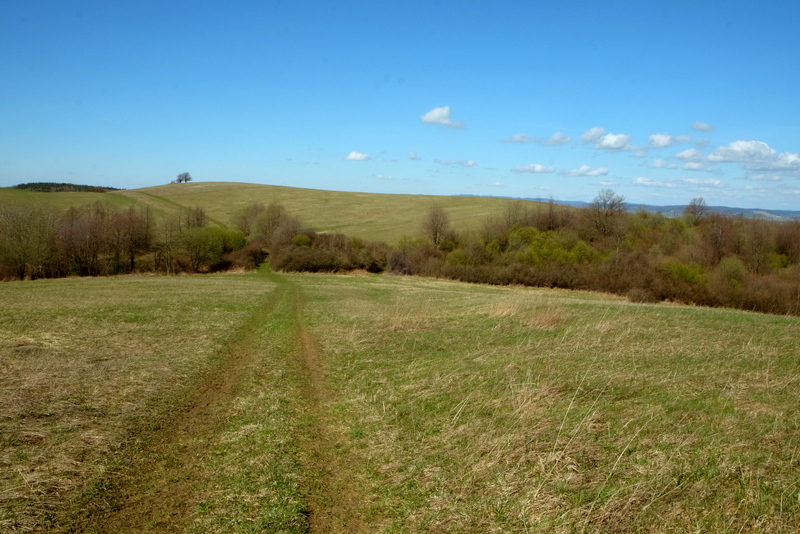 Początkowo bardzo łagodnie wznoszącą się, porośniętą trawą polną dróżką kieruję się na północny zachód. Jest tu jeszcze mokro bo w nocy przechodził tędy zimny front z opadami deszczu. Świecące słońce i wiejący dość mocno wiatr wkrótce dadzą sobie z tym radę tak, że po mokrej trawie nie będzie śladu.