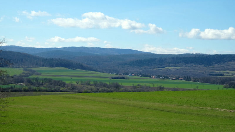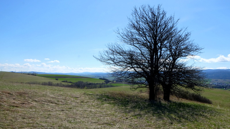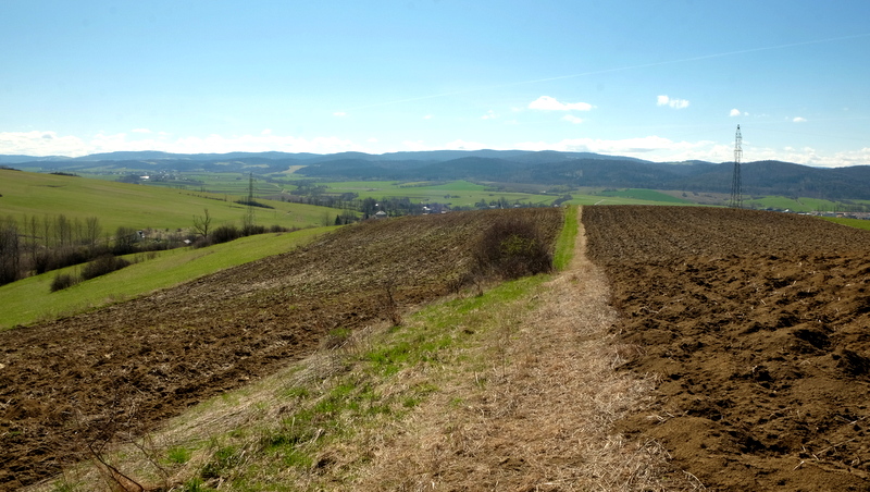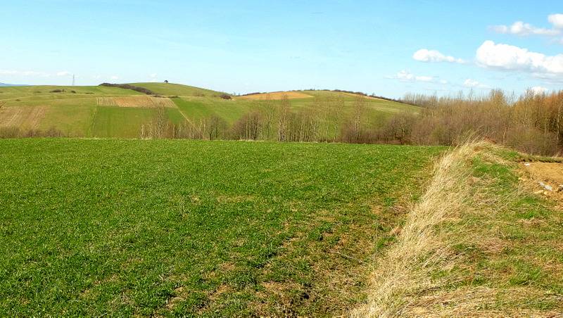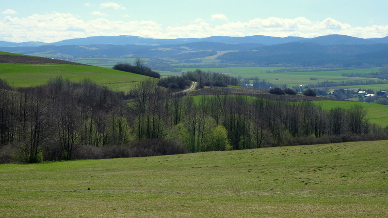 W swoim dalszym ciągu szlak trawersuje od południa kolejne wzgórze. Kolejny więc raz opuszczając polną drogę podchodzę na wierzchołek (469 m n.p.m.) tego bezimiennego wzgórza aby i z niego spojrzeć na okolicę. Stąd na „krechę” udaję się w kierunku widocznej z góry ściany lasu.