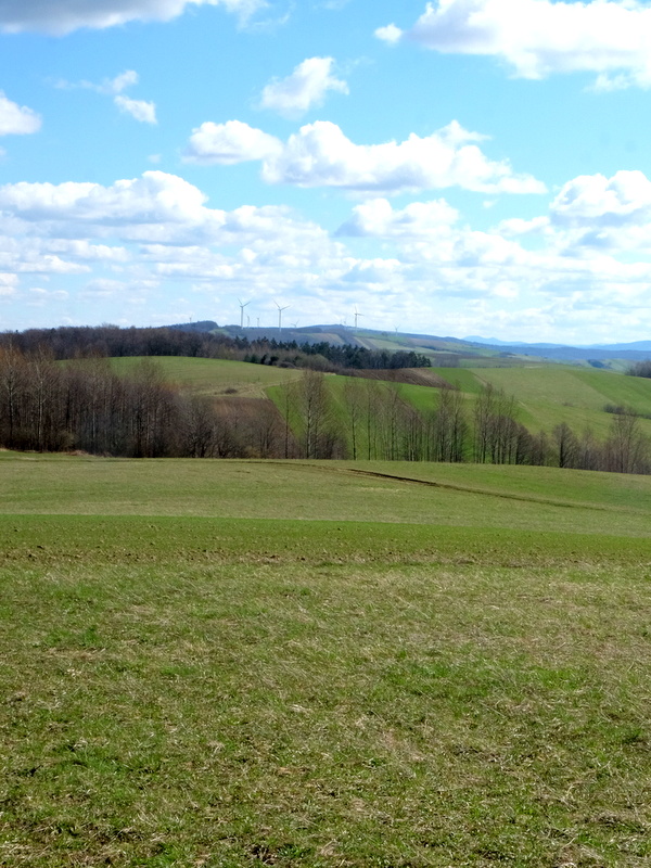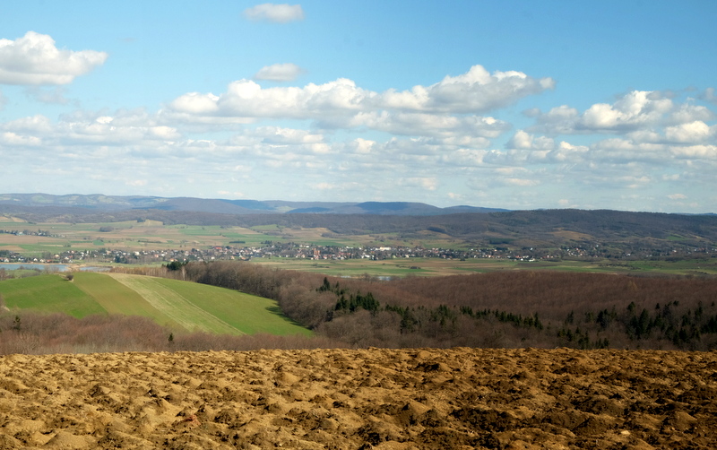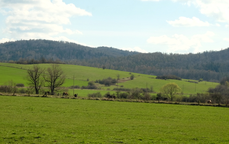 Podobnie i sąsiedni szczyt – zwany Turową Górą – polna dróżka również omija od południa. Także i na jej szczyt wchodzę – tutaj jednak przez przeorane pole w przełączce między tymi dwoma szczytami. Widoki również piękne, podobne do tych z sąsiedniej Caryńskiej ale prawdę mówiąc z Turowej bardziej mi się podobają.