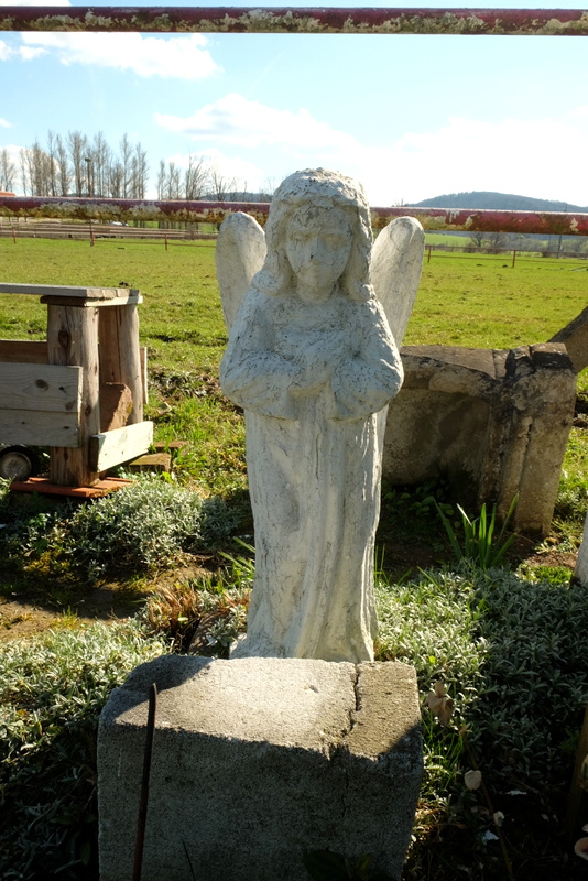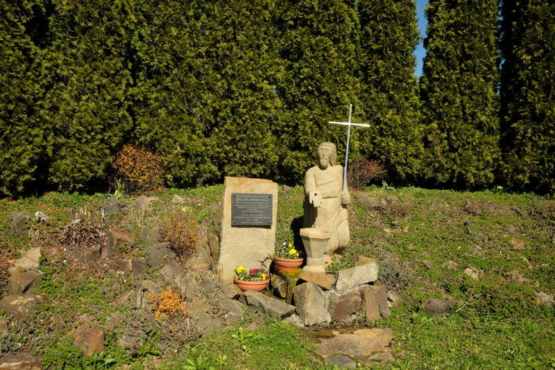 Owa dróżka sprowadza mnie na prywatny teren wokół domostwa, przez który wypadałoby przejść ale, że to czyjaś własność, więc nie bardzo wypada. Można by też podjąć próbę pokonania głębokiego jaru potoku, którego stromizny nastręczają wiele trudności. Decyduję się jednak przejść przez ten prywatny teren ryzykując, że obszczeka mnie zamkniety w kojcu owczarek niemiecki. Pojawiającą się na ten hałas właścicielkę owych włości pozdrawiam turystycznie z uśmiechem na twarzy, przepraszając równocześnie że się tutaj niespodziewanie pojawiłem. Ona też odpozdrawiając mnie uspokaja psa i wszystko wraca do normy – czyli spokoju. W taki oto sposób dochodzę do asfaltowej drogi w tej części Odrzechowej, która przez przełęcz między Turową Górą a Patryją prowadzi do Zarszyna. Idę tą drogą mijając niewielki, kamienny obelisk z inskrypcją i stojącą obok figurką św. Jana Chrzciciela.