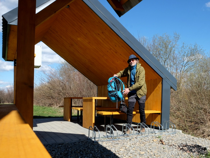 Obok niej przygotowane miejsce na ognisko i stojak rowerowy. Jest tu także duża, zadaszona tablica informacyjna ze schematem szlaku pieszo – rowerowego. Jednym słowem znajduje się tu pierwszy spotkany przeze mnie MOR (Miejsce Obsługi Rowerzystów) na tej trasie.