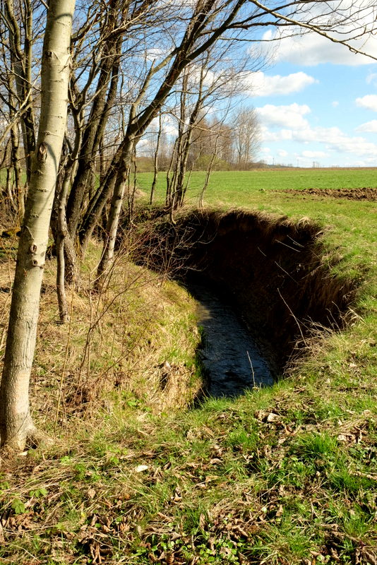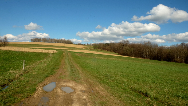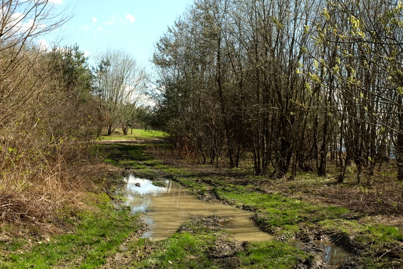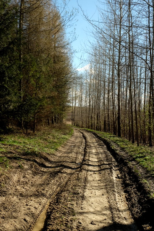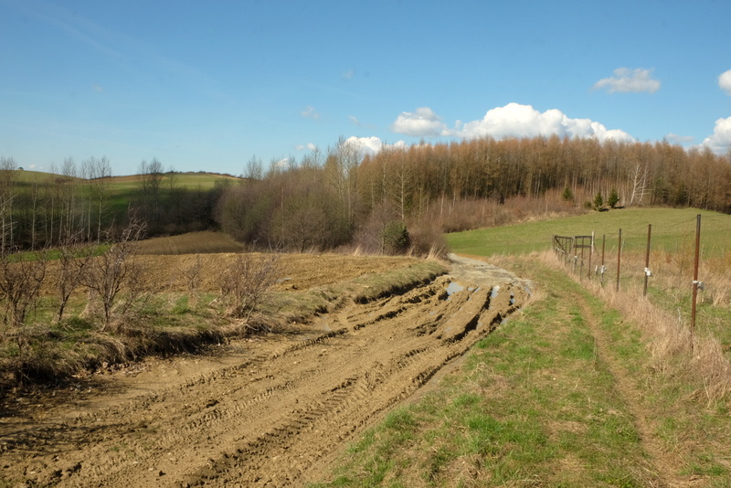 Teren tutaj podmokły, droga przez las szeroka i pełna głębokich kolein wypełnionych wodą. Odcinek przez las nie jest długi a po wyjściu z lasu droga wydaje się być w jeszcze gorszym stanie. Tutaj z powodu jeszcze głębszych kolein wyżłobionych przez koła dużych traktorów.