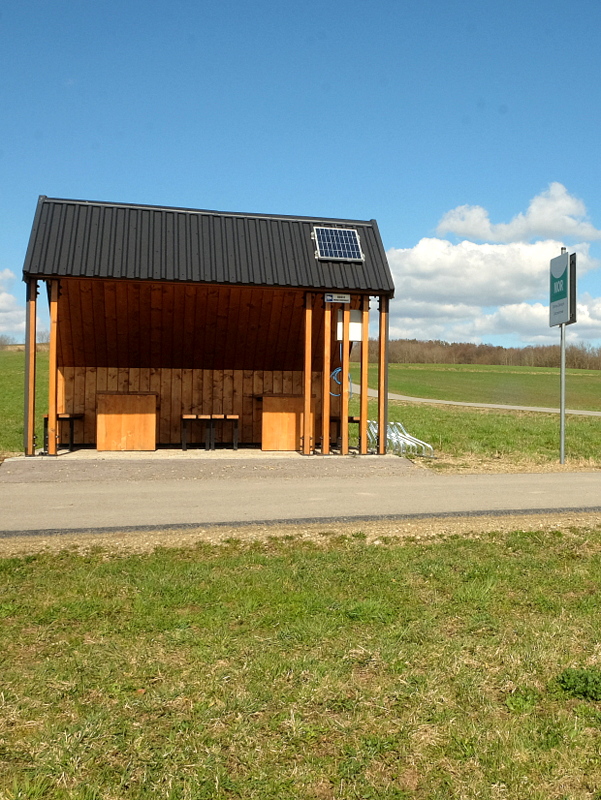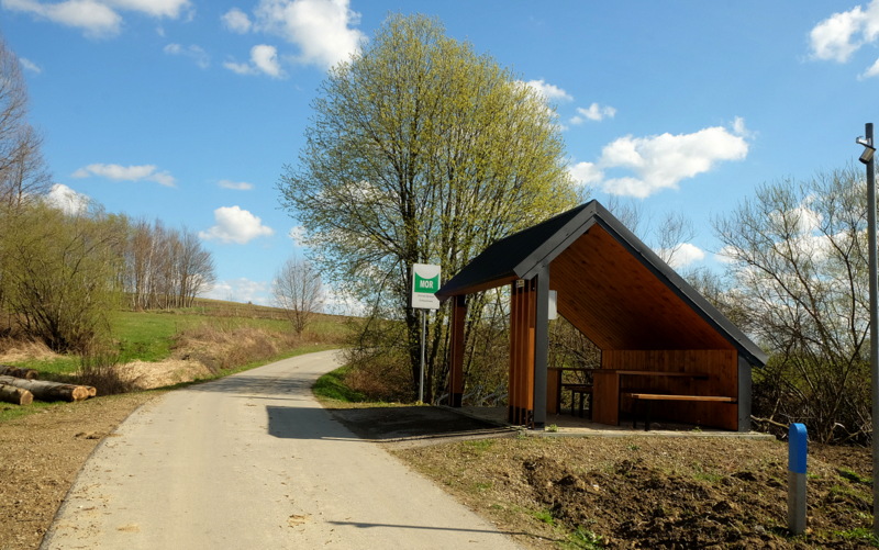 Jest ona jednym z najciekawszych punktów projektowanej przez gminę Zarszyn ścieżki pieszo-rowerowej. Zbudowano już kilka punktów tzw. MOR-ów (Miejsc Obsługi Rowerzystów), z których trzy będę jeszcze mijał na swojej trasie. Wtedy też więcej o nich opowiem. Przy wejściu do wiaty ustawiono obelisk z tablicą pamiątkową. Sam środek wiaty jest pusty ale przy wszystkich wewnętrznych ściankach ustawione są ławeczki. W jednym z narożników znajduje się skrzynka z zeszytem-księgą do pamiątkowych wpisów i pieczątką dla „kolekcjonerów i zdobywców” Korony Ziemi Sanockiej.