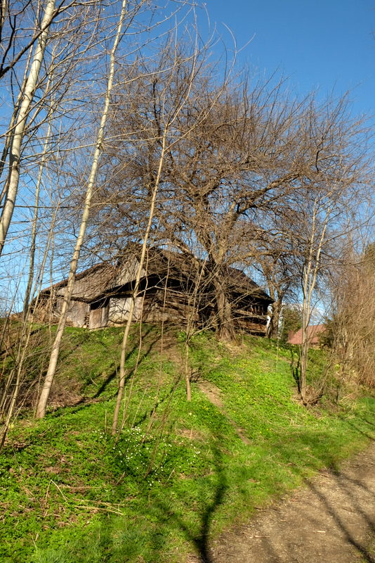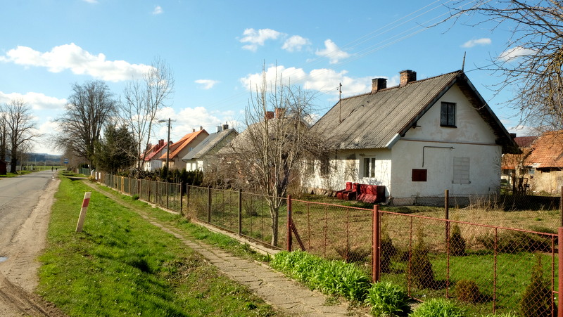 Odtąd zabudowania wsi będą się ciągnęły po ou stronach Czemyślanki, dzielącej wieś na części: południową i północną. Mijam przydrożny krzyż stojący w otoczeniu wysokich drzew, dalej duży tartak, przy którym opuszczam drogę główną. Idąc dalej południowo-wschodnim skrajem wsi, mijam dawne, zachowane do dzisiaj skromne zabudowania.