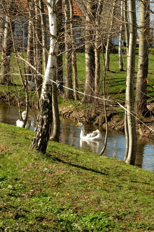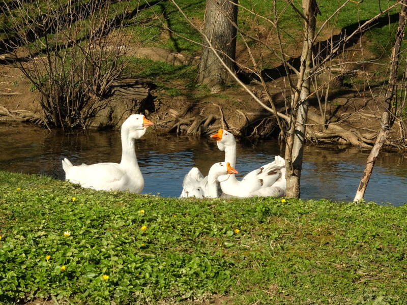 Obok jednego z domostw nad potokiem kilka białych gęsi zarzywa kąpieli.