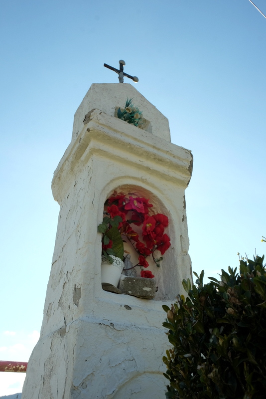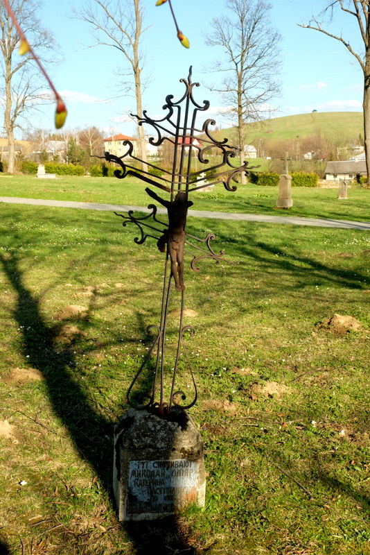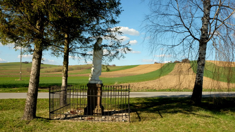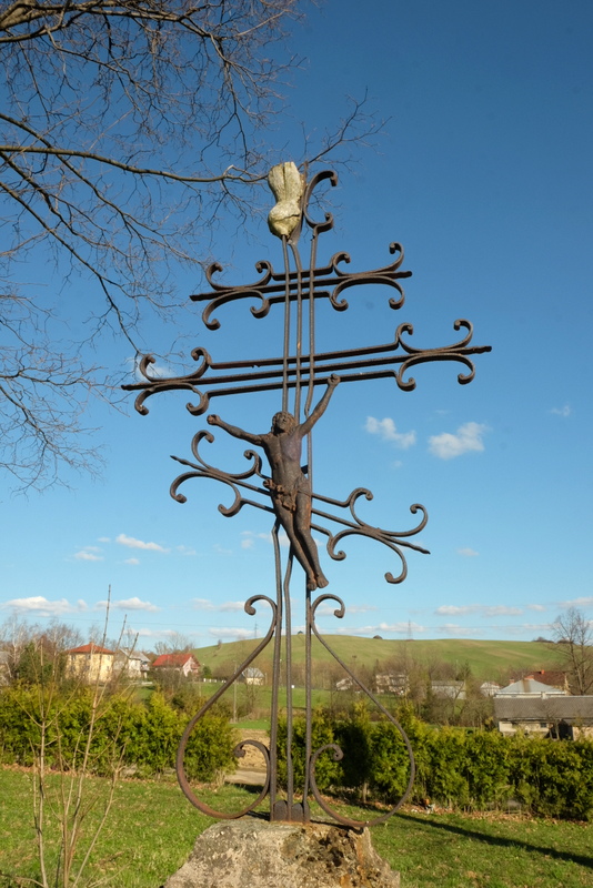 Za mostem skręcam w prawo idąc dalej wzdłuż rzeczki przez środkową część wsi. Na jednym z rozdroży po świerkami stoi figurka – jak się dowiedziałem jest ona poświęcona łemkowskim emigrantom, którzy na przełomie wieków XIX i XX emigrowali do Ameryki. Ten ciekawy w formie pomnik pochodzi z roku 1910.