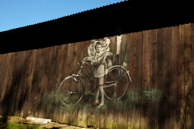 Skręcam w pierwszą odchodzącą w prawo uliczkę aby przejść przez most nad Czemyślanką do północnej strony wsi. Wcześniej jednak, na ścianie drewnianego budynku gospodarczego zauważam ciekawą ilustrację: