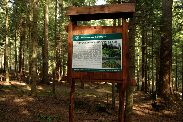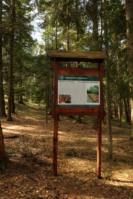 Zaraz po wejściu do lasu pojawia się tablica informacyjna o przystanku nr jeden. Dowiadujemy się z niej o pracy leśników przy pozyskiwaniu drewna gdyż niedaleko stąd znajduje się plac, na którym drewno jest składowane.