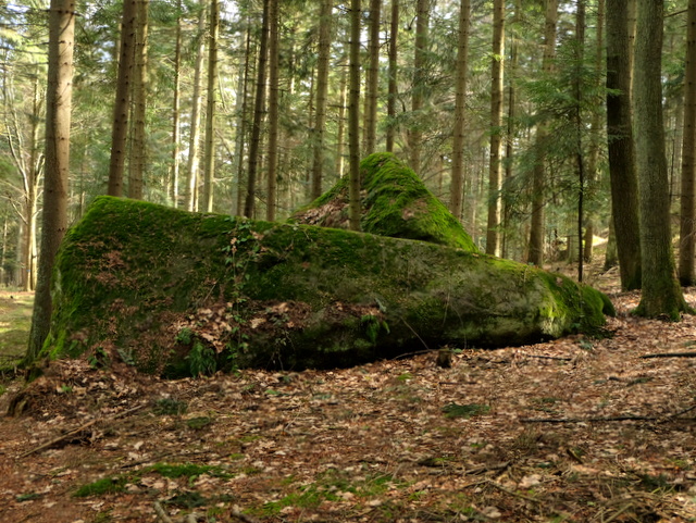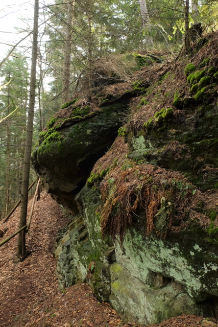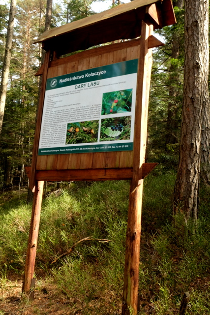 Można tu na nie spojrzeć od dołu, skąd ciekawie i inaczej się prezentują wieńcząc strome zbocza. W ten sposób dochodzę do wierzchowiny gdzie znajduje się ostatni już, siódmy przystanek tej ścieżki – “Dary Lasu”. Opisano tu co dobrego, smacznego i pożytecznego można znaleźć w lesie, jego runie i podszyciu. Będą to jagody, owoce, grzyby i przeróżne zioła.