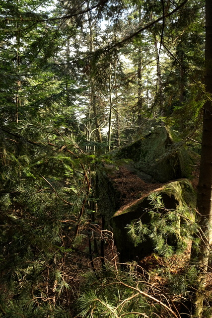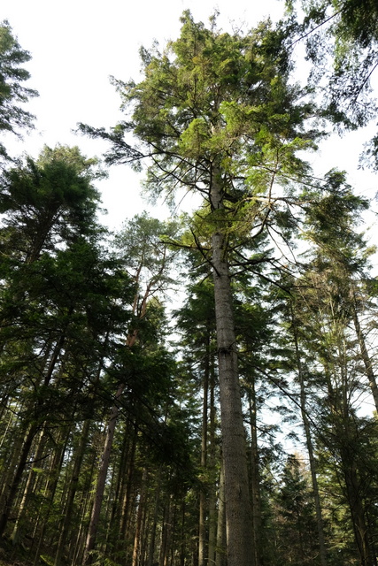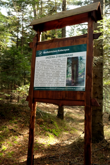 Po obejrzeniu wodospadu i jego otoczenia oraz po zrobieniu wielu zdjęć opuszczam ten teren kierując się ścieżką omijającą od dołu Zaginione Skałki. Wkrótce dochodzę do potężnej jodły i kolejnej tablicy informującej o szóstym przystanku tej ścieżki. Jest tu pokrótce opisane na czym polega hodowla lasu. Jaka jest rola starszych drzew i nasion z nich pozyskiwanych. O sadzonkach i pielęgnacji młodników.