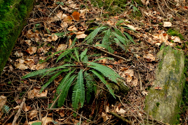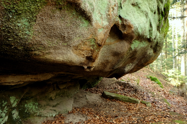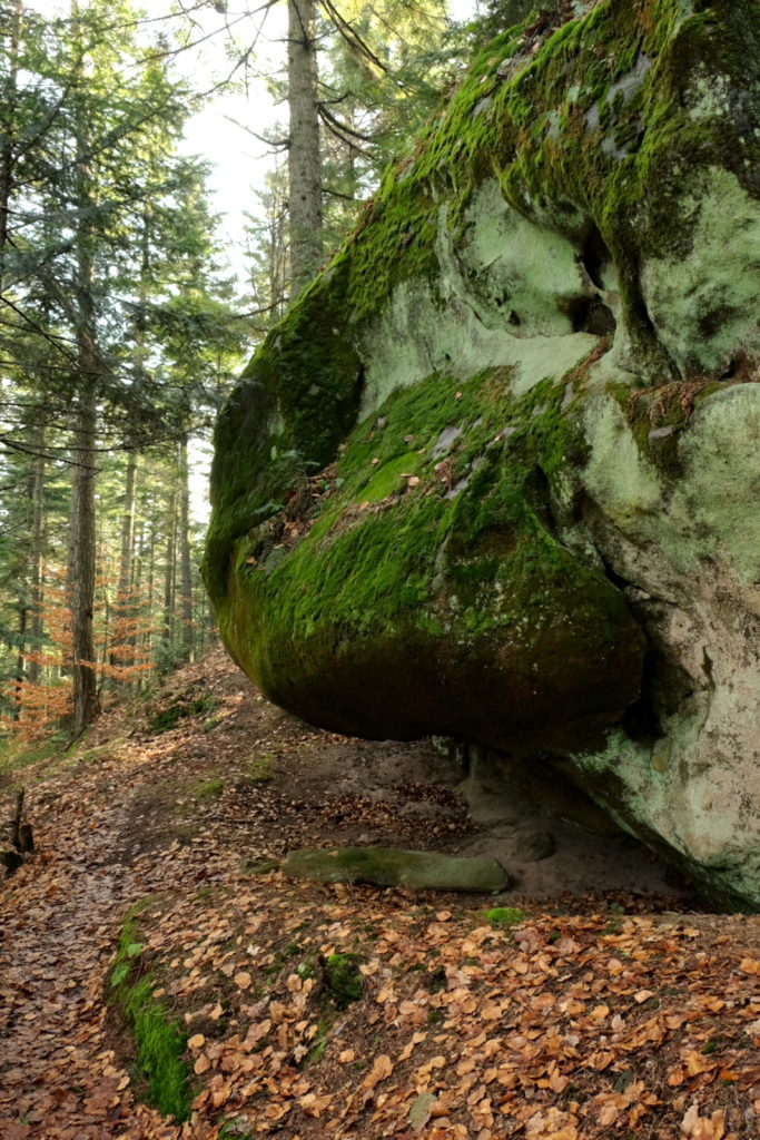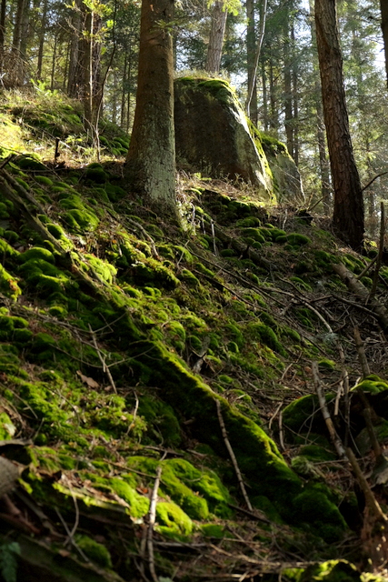 Powyżej wodospadu, na stromym stoku leży dość duży głaz skalny. Wokół zielenią się już pojedyncze liście paproci oraz kępki zielonych mchów i innych porostów.