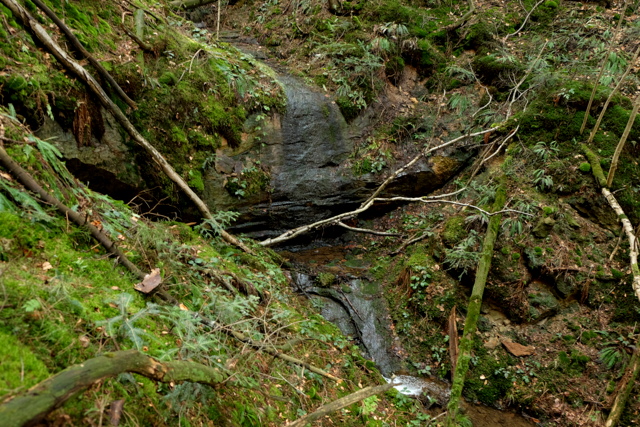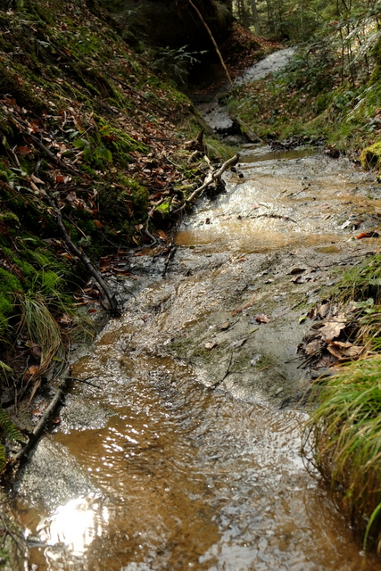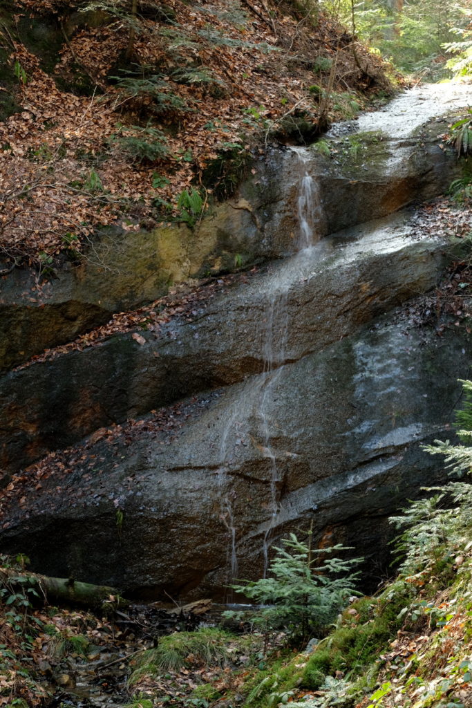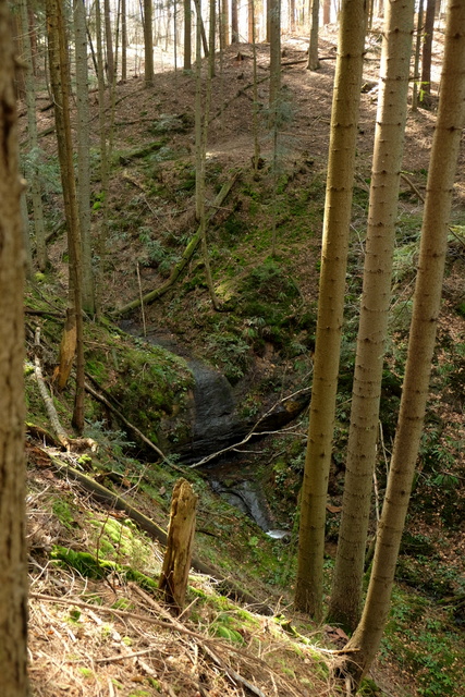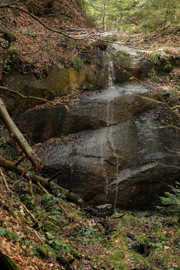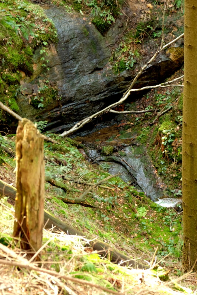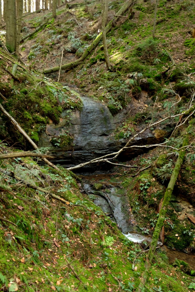 Aby do niego dojść przekraczam drogę i idę w kierunku północno-zachodnim szukając jaru potoku. Znajduję jakiś jar i idę w górę tego jaru. Płynie nim jakaś strużka wody ale jest za mała więc kieruję się w dół. Przyłącza się boczny jar więc na nim próbuję odszukać wodospad jednak bez powodzenia. Wracam więc do tego większego, który w miarę schodzenia w dół staje się coraz głębszy. Robi się naprawdę bardzo stromo. W dogodnym miejscu przechodzę na jego drugą stronę i stąd próbuję go wypatrzeć. Nasłuchuję też szumu wody. W końcu udaje mi się go dostrzec więc schodzę do niego.