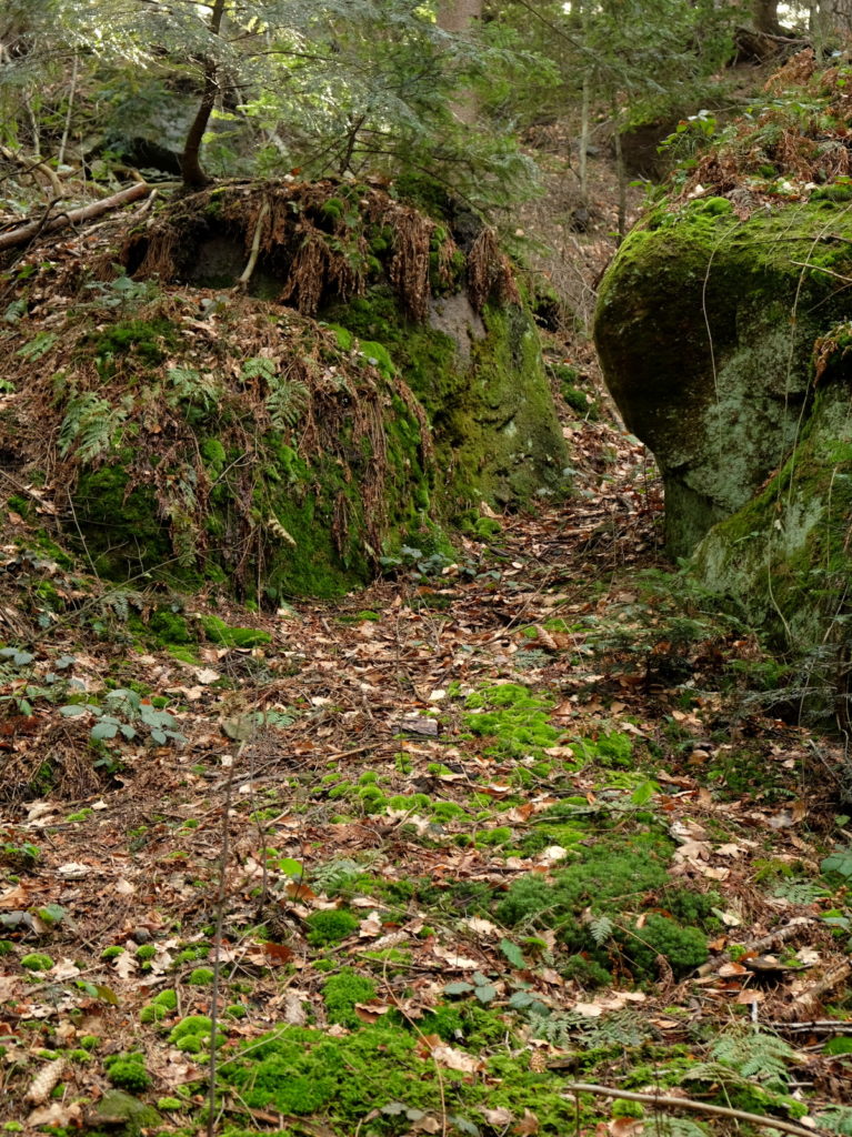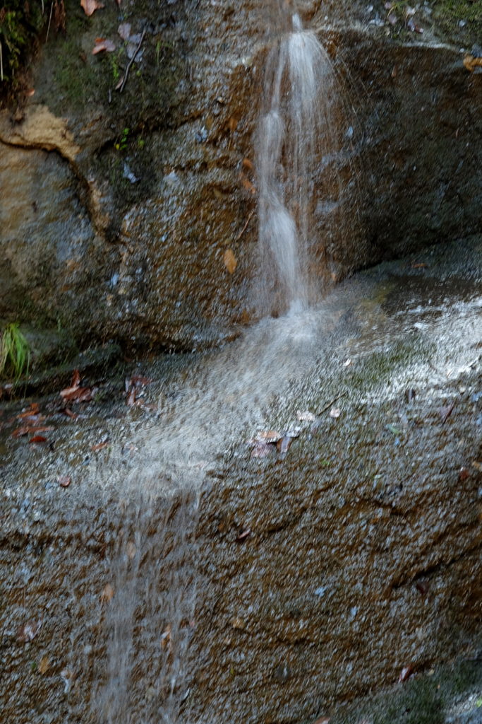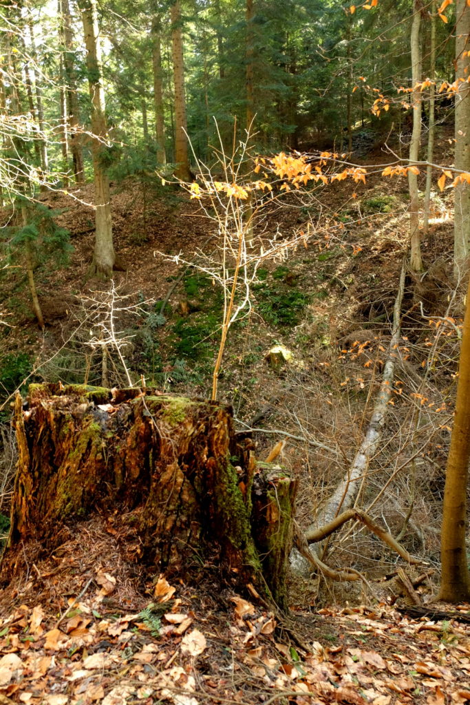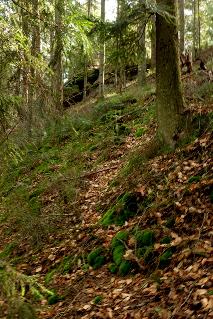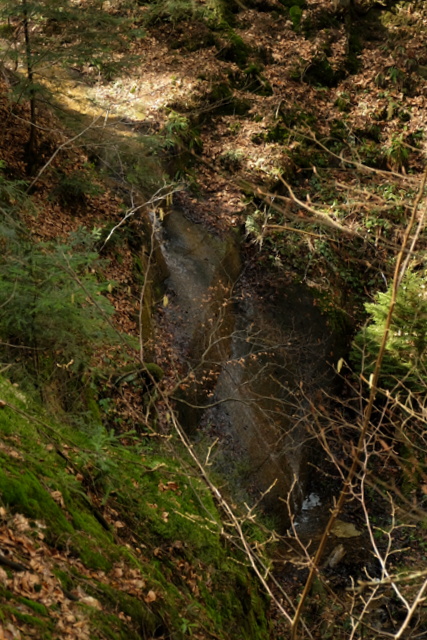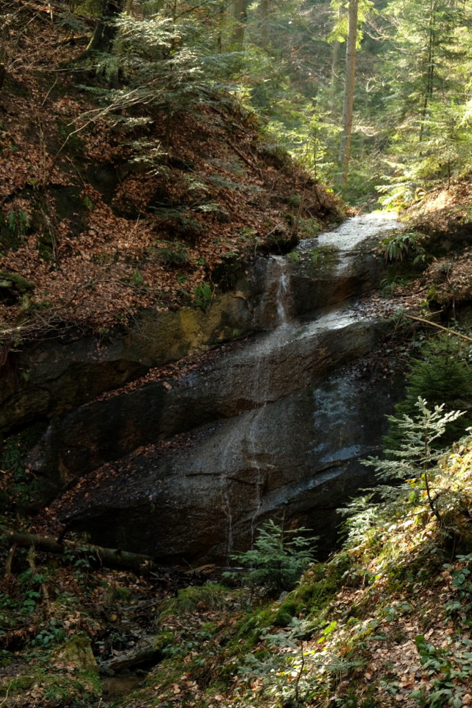 Aby do niego dojść przekraczam drogę i idę w kierunku północno-zachodnim szukając jaru potoku. Znajduję jakiś jar i idę w górę tego jaru. Płynie nim jakaś strużka wody ale jest za mała więc kieruję się w dół. Przyłącza się boczny jar więc na nim próbuję odszukać wodospad jednak bez powodzenia. Wracam więc do tego większego, który w miarę schodzenia w dół staje się coraz głębszy. Robi się naprawdę bardzo stromo. W dogodnym miejscu przechodzę na jego drugą stronę i stąd próbuję go wypatrzeć. Nasłuchuję też szumu wody. W końcu udaje mi się go dostrzec więc schodzę do niego.