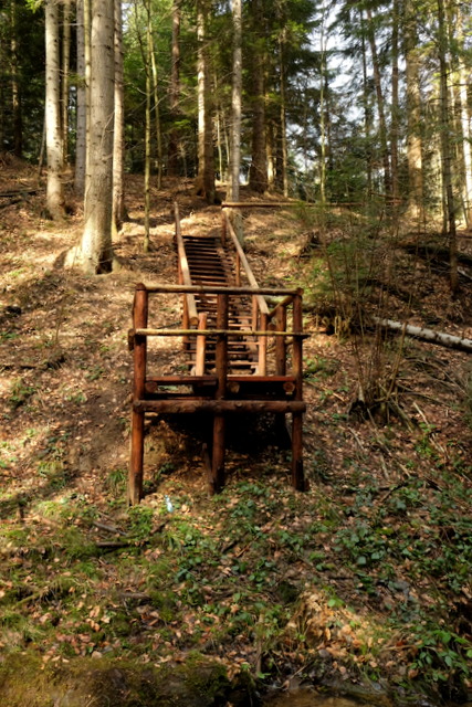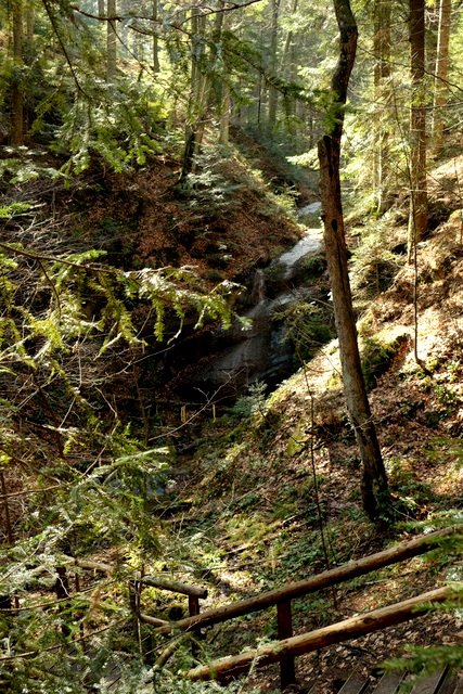 Podobnie w jesieni, gdy jest tu dużo liści i zimą – oblodzenia. Dlatego przygotowano tu specjalną platformę widokową, do której prowadzą oporęczowane, drewniane schodki. Mimo to trzeba uważać schodząc w dół i trzymać się poręczy bo drewno bywa tu bardzo śliskie. Poniżej wodospadu też bywa bardzo mokro i grząsko więc nie radzę przechodzić na drugą stronę potoku.