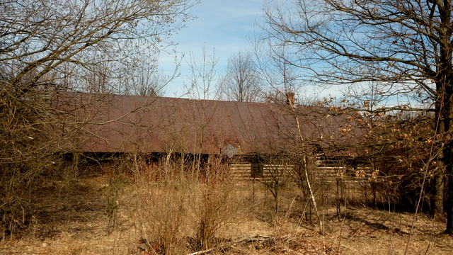 Po wyjściu na otwarty teren dostrzegam w oddali, pod ścianą lasu bardzo zaniedbane drzewa owocowe i ledwo widoczny wśród nich stary drewniany dom z bali.