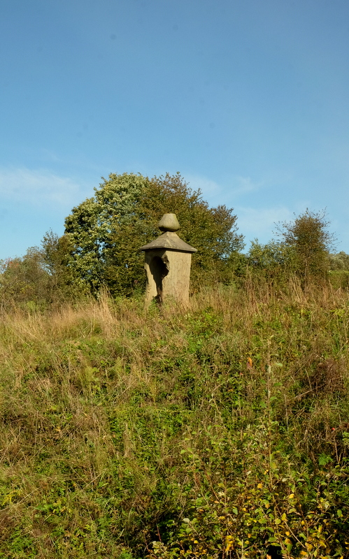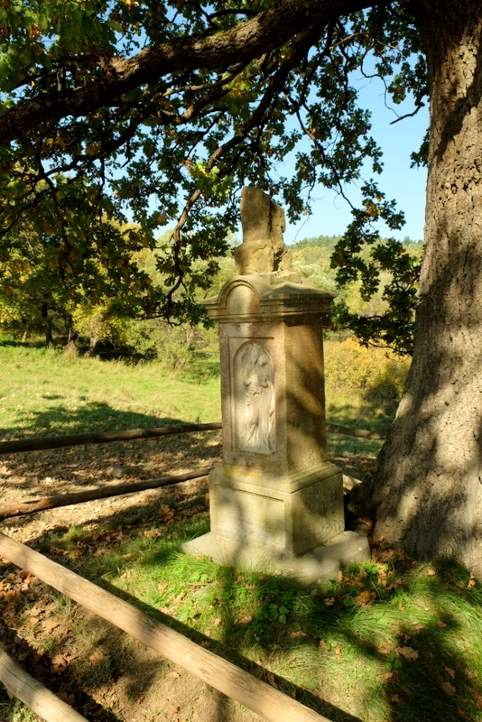W sąsiedztwie kapliczki leżą na trawie połamane części przewróconego i rozbitego, kamiennego krzyża, który jeszcze jakiś czas temu, chociaż niekompletny ale jednak stał. Miejmy nadzieję, że któregoś dnia i on doczeka się remontu.