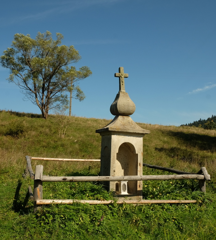 W odległości ponad kilometra od przełęczy, na skarpie ponad drogą stoi kapliczka wnękowa z 1907 roku.