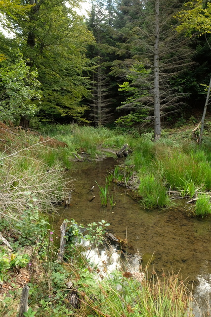Przy granicy lasu zaczynają się podmokłe łąki i teren staje się trudniejszy do przejścia. Aby tego uniknąć wchodzimy na leśną ścieżkę i nią dochodzimy do granicy. W niewielkiej odległości od granicy znajduje się jeden ze źródłowych cieków Wisłoki ale nie idziemy go szukać. Po dojściu do granicy skręcamy w prawo i idziemy za znakami czerwonego, granicznego szlaku słowackiego. Tak schodzimy do przełęczy.